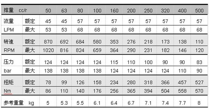 最大工作壓力指入口最大允許壓力,額定工作壓力指工作壓差不應同時在最大轉速和最大壓力下使用馬達,最大工作條件允許持續的時間為6秒推薦用油: 抗磨液壓油,粘度37~73cst,油液清潔度ISO18/13最高工作油溫80°C