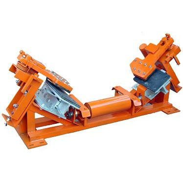 DDZ-30/80、100、1200、1400型帶式輸送機用斷帶抓捕器沿帶式輸送機多處安裝,當皮帶正常運行時,中部的單向輥輪隨皮帶轉動,左右兩楔形閘塊處于皮帶下方且與皮帶不接觸,上閘塊調整到皮帶兩側,且與皮帶縱向平行。當發生斷帶時,觸動裝置使上閘塊快速轉動到皮帶上方,同時帶動楔形閘塊繼續沿楔形槽運動,將下滑的皮帶夾持制動在上閘塊與楔形閘塊之間,阻止斷帶下滑。