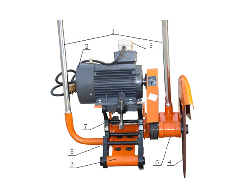 1操縱桿、2電動機、3擺臂、4主軸薄片砂輪、 5夾具、6切割臂、7走行輪、8、開關(guān)按鈕