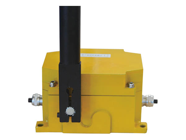 該產品按照一定間隔安裝在膠帶機的行人一側,相鄰兩臺之間用鋼絲繩通過開關上的擺臂連接起來。當膠帶機發生緊急情況拉緊鋼絲繩時,驅動內部凸輪,使行程開關動作并閉鎖,實現緊急停車同時發出報警信號。故障排除后,人工解鎖允許膠帶機運行。